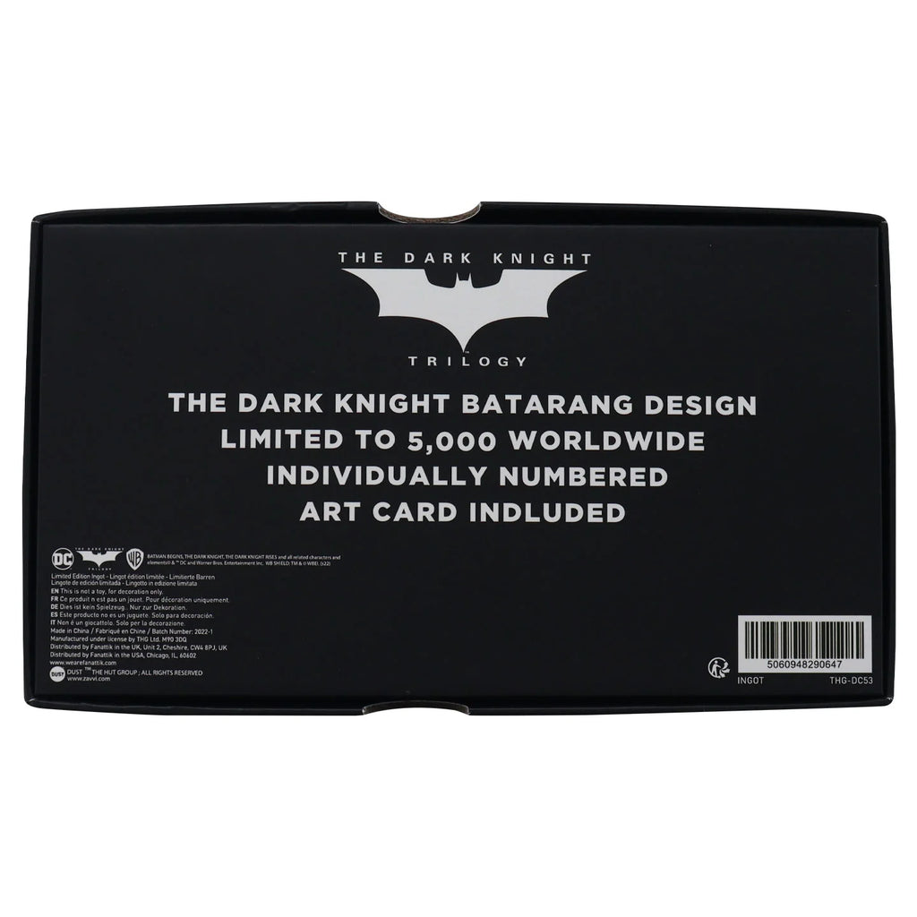 We are proud to present this officially licensed replica of Batman's Batarang as seen in the Dark Knight Trilogy. Limited to only 5,000 worldwide, this collectible is individually numbered and comes with a built-in display stand in its presentation box.
