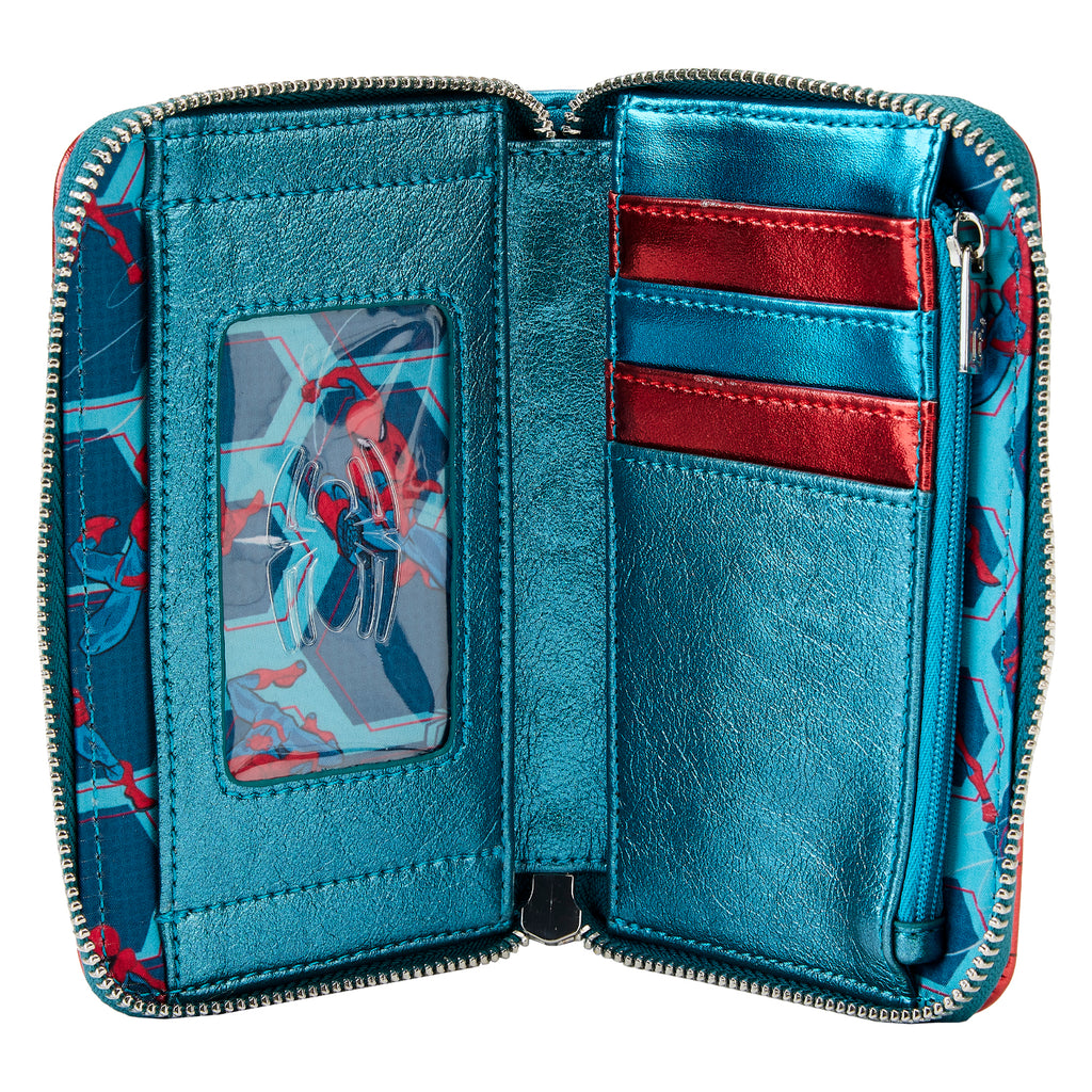 This officially licensed Loungefly Marvel Metallic Spider-Man Zip Around Wallet is made of vegan leather (polyurethane). Wallet zips closed with sturdy metal hardware. Additional features include applique, holographic, debossed, and printed details. Take note of the coordinating inside lining. It measures at approximately: 6”W x 4”H.